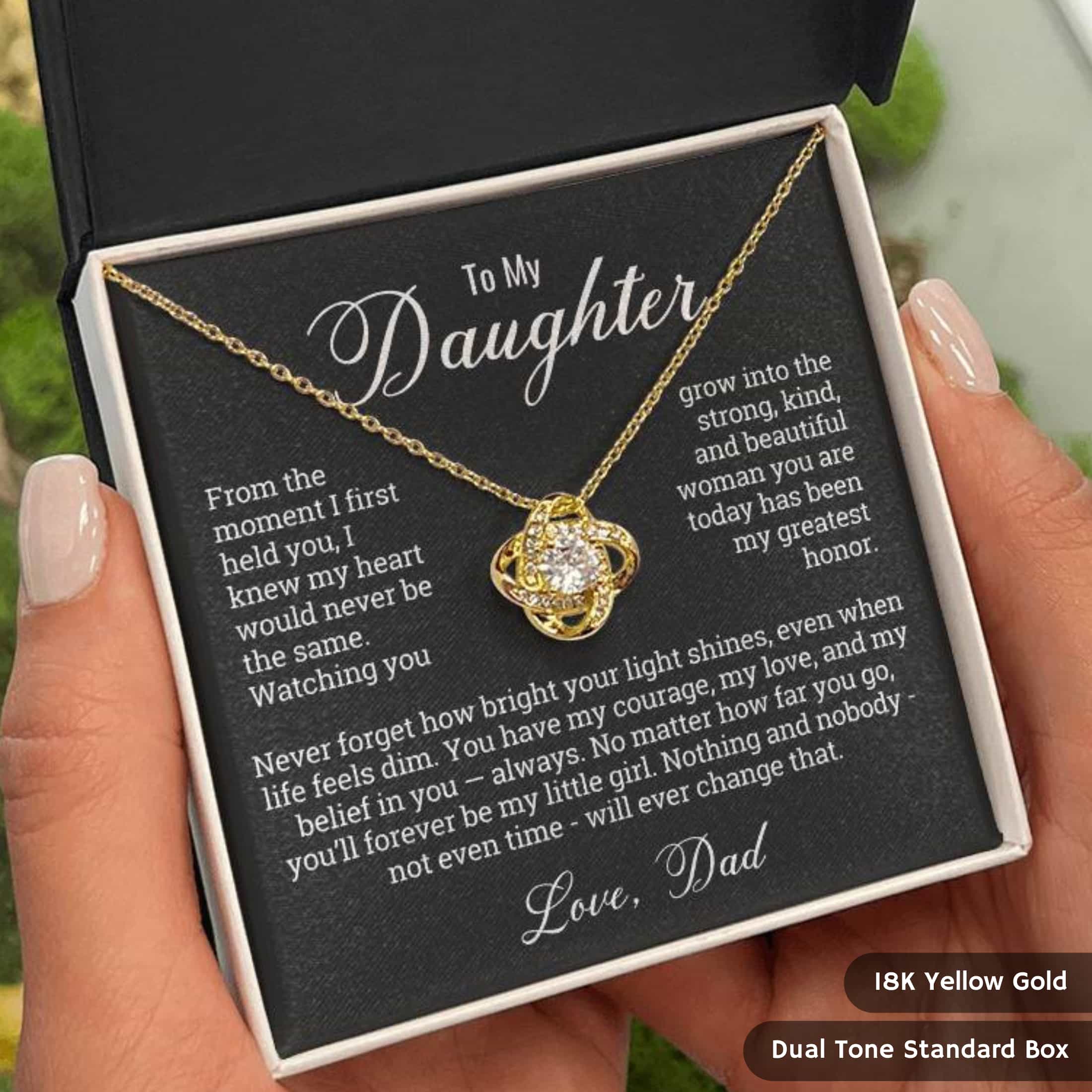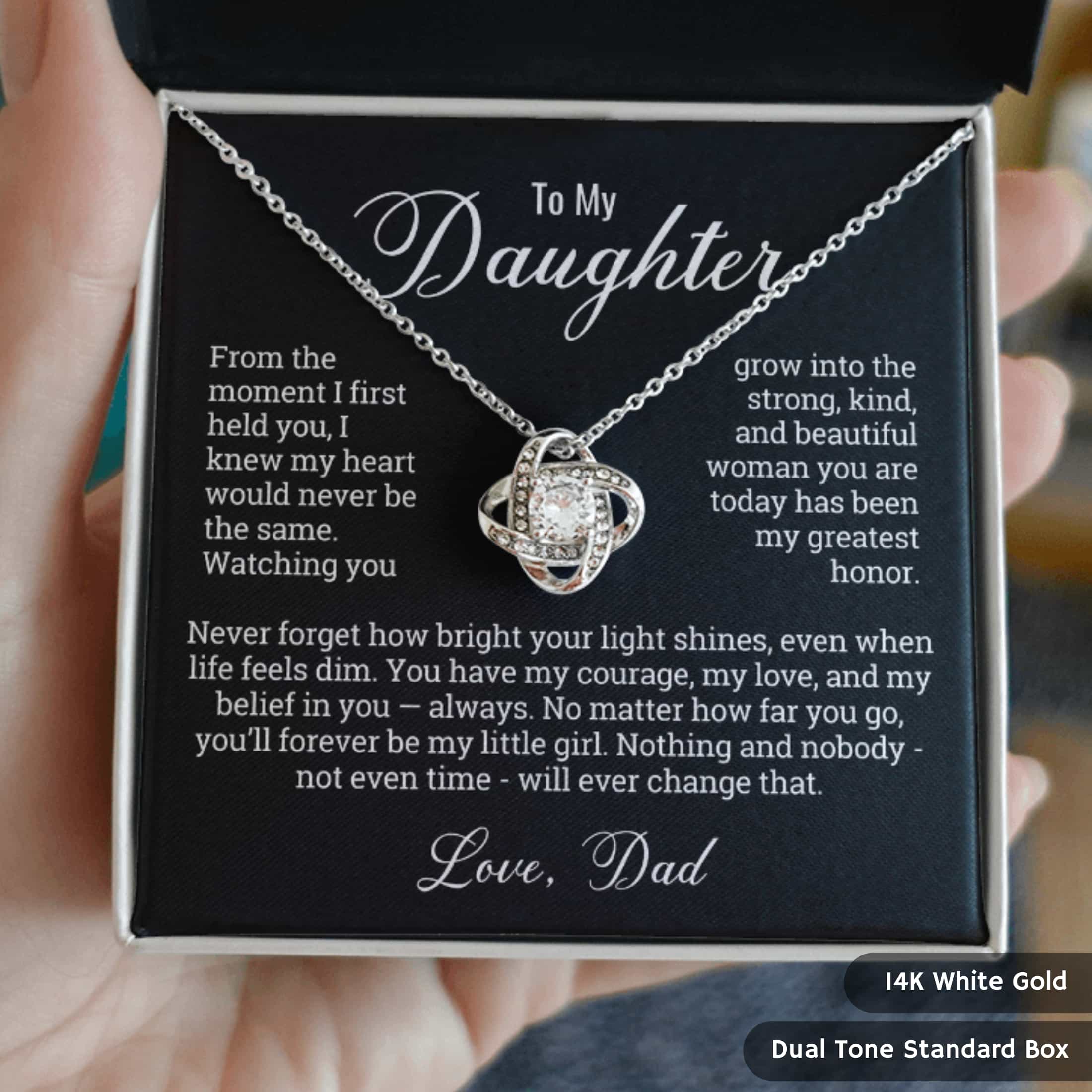 Imagine her opening the elegant box, the soft glow reflecting off a necklace that captures your love perfectly. Her eyes light up, her smile says it all. In that moment, she feels every ounce of your love and the pride you carry for her. This isn’t just a gift; it’s an unforgettable memory she’ll cherish forever, a symbol of love she’ll hold close to her heart.