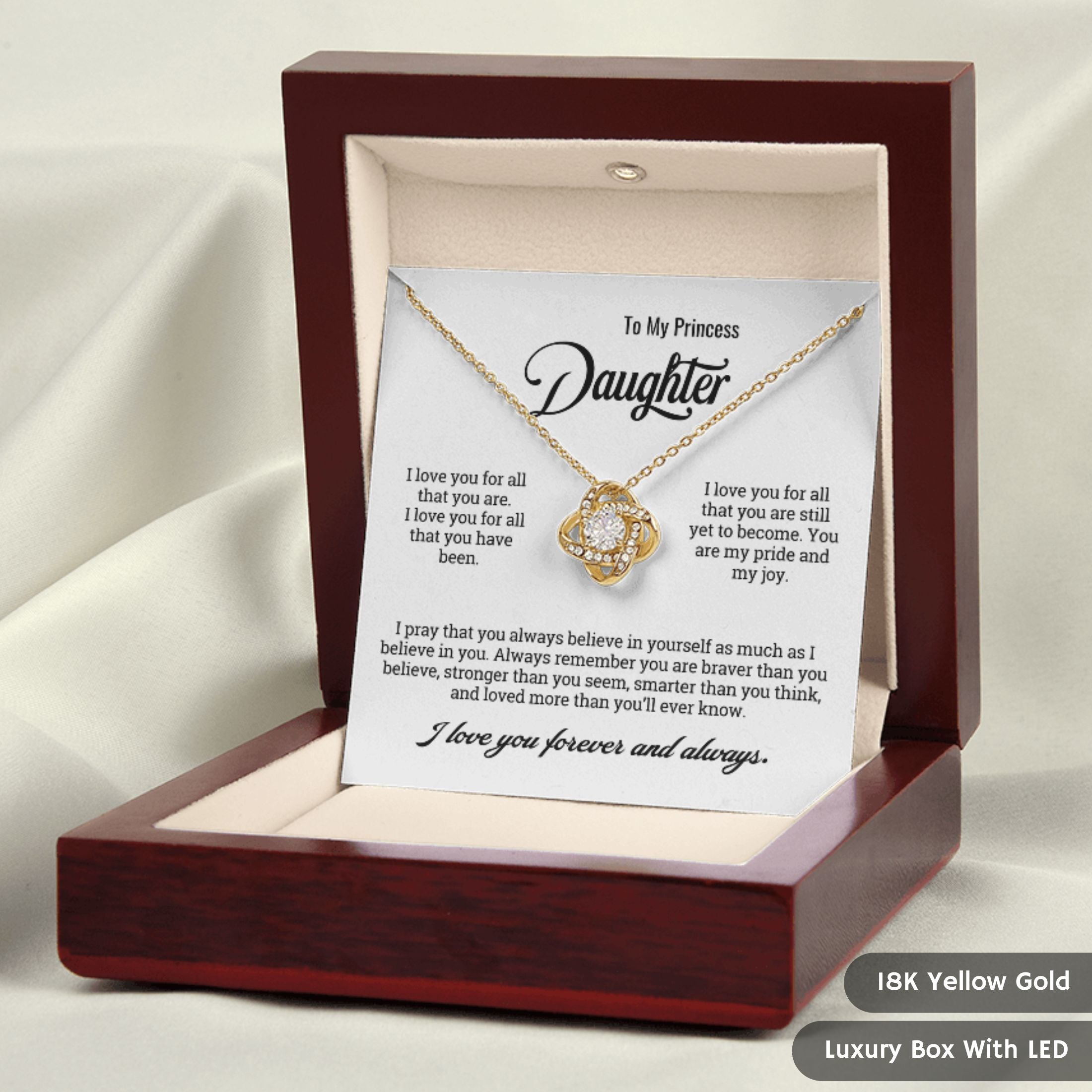 Imagine her opening the elegant box, the soft glow reflecting off a necklace that captures your love perfectly. Her eyes light up, her smile says it all. In that moment, she feels every ounce of your love and the pride you carry for her. This isn’t just a gift; it’s an unforgettable memory she’ll cherish forever, a symbol of love she’ll hold close to her heart.
